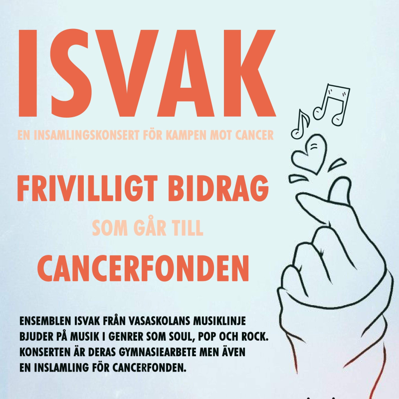 Ensemblen ISVAK från Vasaskolans musiklinje har satt ihop en insamlingskonsert, de insamlade pengarna går till Cancerfonden och kampen mot cancer. Konserten är deras gymnasiearbete och äger rum den 10:e maj på Musikhuset i Gävle.